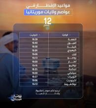 تتراوح أوقات الإفطار اليوم الاثنين ثاني عشر أيام شهر رمضان المبارك 1447 هجرية، في عواصم الولايات الموريتانية ما بين 18:39 دقيقة في مدينة النعمة عاصمة ولاية الحوض الشرقي، و19:16 دقيقة في مدينة نواذ