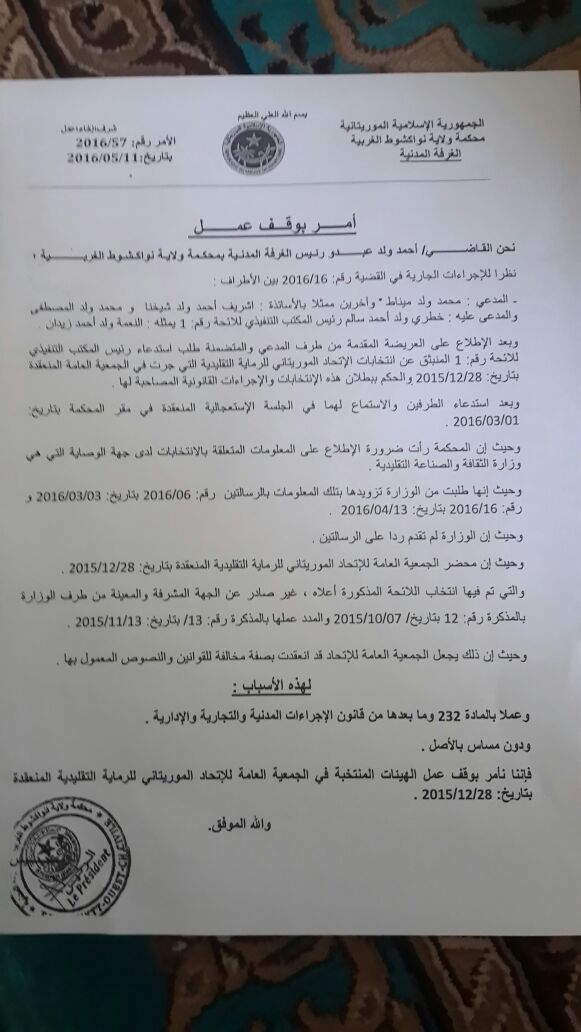 اعلن القاضي /احمد ولد عبدو رئيس القرفة المدنية بمحكمة ولاية انواكشوط الغربية أمر بإيقاف عمل الهيئات المنتخبة في الجمعية العامة للإتحاد الموريتاني لرماية التقليدية المنعقدة بتاريخ :28/18/2015
