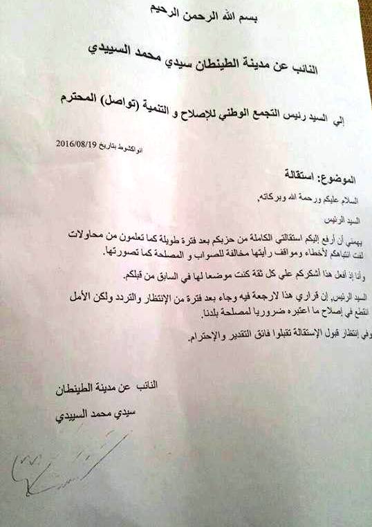 كما كان منتظراً، أعلن النائب عن مقاطعة الطينطان سيد محمد السييدي صباح اليوم الجمعة استقالته من حزب تواصل المعارض..