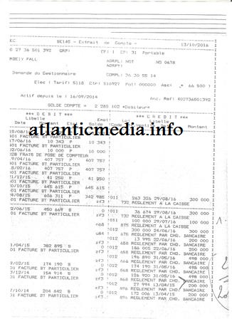 وتوضح الوثيقة أن السيد موسى أفال رئيس الحركة من أجل التغيير الديمقراطي مُدان للشركة الوطنية للكهرباء بمبلغ 2.285.102 وهي قيمة استهلاك منزله ND 0678 وهو ما دفع الشركة بعد أن أمهلته 10 أشهر لقطع الكهرباء عن المنزل المذكور.