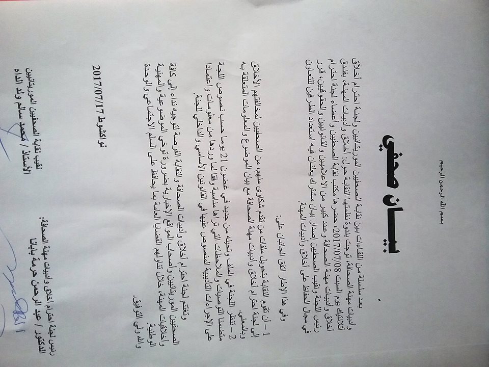 بعد سلسلة من اللقاءات بين نقابة الصحفيين الموريتانيين ولجنة احترام أخلاق وأدبيات مهنة الصحافة، توجت بندوة نظمتها النقابة حول: أخلاق وأدبيات المهنة، بفندق آتلانتيك يوم السبت 08/07/2017، حضرها مكتب نقابة الصحفيين وأعضاء لجنة احترام أخلاق وأدبيات مهنة الصحافة وعدد كبير من الإعلاميين والقانونيين والحقوقيين، قرر رئيس اللجنة ونقيب الصحفيين إصدار بيان مشترك يعلنان فيه استعداد الطرفين للتعاون في مجال الحفاظ على أخلاق وأدبيات المهنة الصحفية.