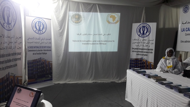 وقد استقطب الكشك الذي أنعشه الصندوق الوطني للضمان الاجتماعي العديد من الزوار ، الذين أتيحت لهم الفرصة لمتابعة عرض على برنامج باور بوينت Powerpoint يتضمن شعارات تحسيسية حول نظام الضمان الاجتماعي ورسائل حول مكافحة الفساد و أخلاقيات الإدارة والشفافية والحكم الرشيد.