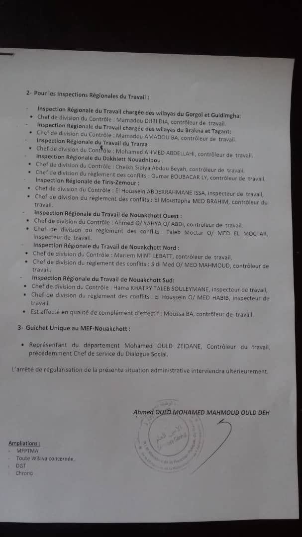 أصدرت وزارة الوظفية العمومية والشغل والتشغيل وعصرنة الإدارة مذكرات شملت إقالة ثلاثة مفتشي عمل جهويين من مناصبهم، كما تم بموجب المذكرات تحويلات شملت أغلب مفتشيات العمل. وحسب المذكرات التي حصلت عليها وكالة الحقيقة الإخبارية فقد تمت إقالة كل من: محمد الأمين ولد بمب الذي كان يشغل منصب المفتش الجهوي للعمل بداخلت أنواذيبو. الحسن ولد عالي الذي كان مفتشا جهويا للعمل في ولاية أنواكشوط الشمالية.