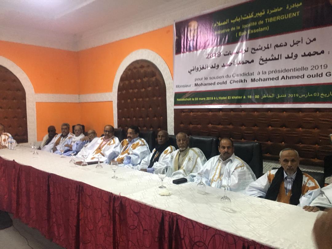 نظمت مساء اليوم في فندق "الخاطر" ساكنة حاضرة تيبركنت (باب السلام) مبادرة لدعم مرشح الرئاسيات 2019 وزير الدفاع الفريق الشيخ محمد ولد الشيخ محمد احمد ولد الغزواني بحضور جماهيري كبير حضر ليعلن عن دعمه ومساندته اللامشروط لمرشح الأغلبية ولد الشيخ محمد احمد.