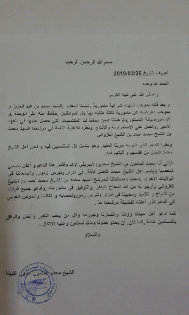 وجاء إعلان ولد الشيخ سعد بوه لدعم ولد الغزواني في بيان حصلت "اتلانتيك ميديا" على نسخة منه.