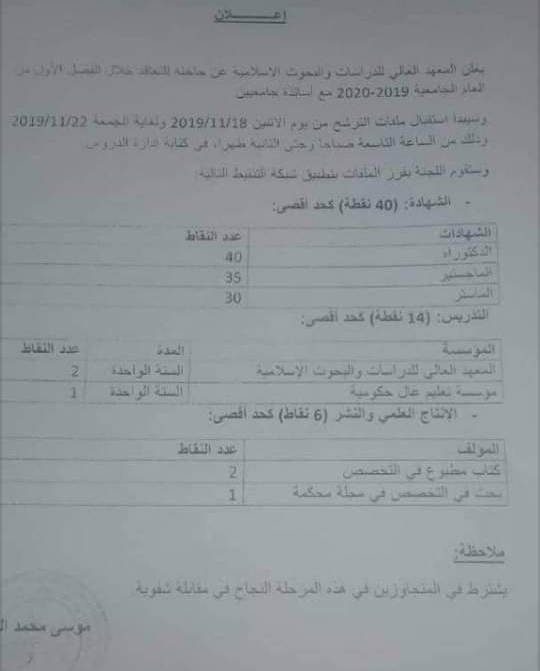 أعلن المعهد العالي للدراسات والبحوث الإسلامية عن اتخاذه قرارا بالتعاقد مع مجموعة من الأساتذة الجامعيين.