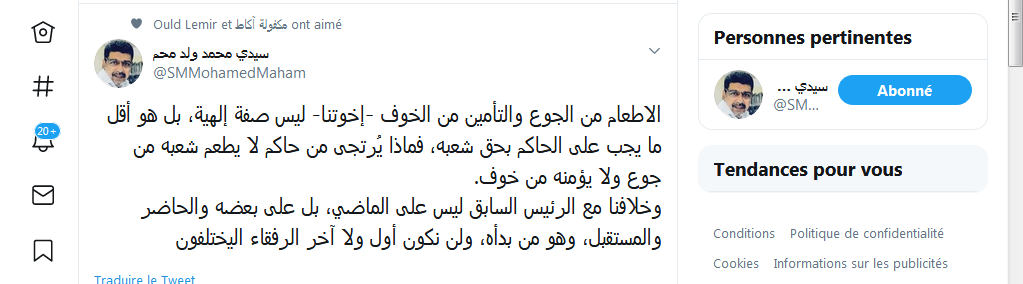قال الوزير ورئيس حزب الإتحاد من اجل الجمهورية السابق السيد سيد محمد ولد محم يوم أمس في تغريدة له على حسابه في اتويتر إن "الإطعام من جوع والتأمين من خوف ليس صفة إلهية بل هو أقل مايجب على الحاكم في حق شعبه".