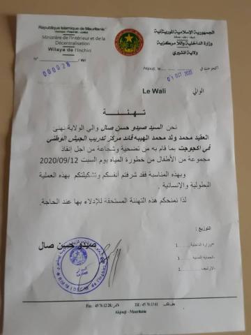 هنأ والي ولاية اينشيري السيد صيدو حسن صال العقيد محمد ولد محمد الهيبه قائد مركز تدريب الجيش الوطني في اكجوجت بما قام به من تضحية وشجاعة من أجل انقاذ مجموعة من الأطفال من خطورة المياه يوم السبت 12 ـ 09 ـ 2020