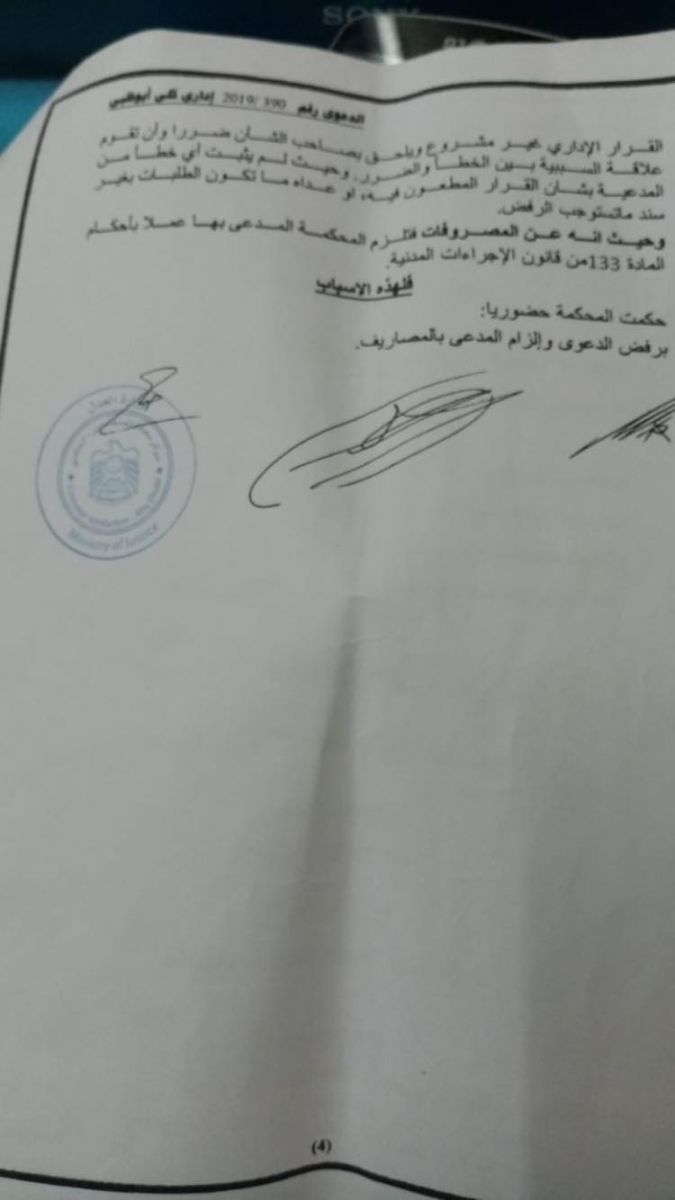 ووجد القاضي نفسه بين قضيتين إحداهما لي والأخرى ضدي فحكم القاضي بالقضية ضدي، وأبدى تأسفه، واعتذاره وأخبرني أنه لا يمكن التراجع عن الحكم الذي أصدر سابقا.