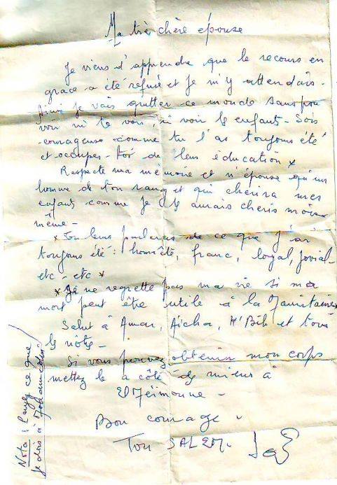 "زوجتى الغالية علمت ان الاخذ بالعفو قد رفض و انني انتظر التنفيذ لذلك ساغادر هذا العالم دون ان اتمكن من رؤىة لا انت و لا الابناء كوني شجاعة كما كنت دوما واهتمي بتربيتهم واحترمي ذكراي