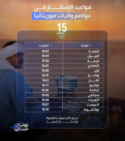 تتراوح أوقات الإفطار اليوم الخميس الـ15 من أيام شهر رمضان المبارك 1447 هجرية، في عواصم الولايات الموريتانية ما بين 18:40 دقيقة في مدينة النعمة عاصمة ولاية الحوض الشرقي، و19:17 دقيقة في مدينة نواذيبو عاصمة البلاد الاقتص