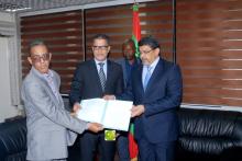 سلم وزير الثقافة والصناعة التقليدية والعلاقات مع البرلمان الناطق الرسمي باسم الحكومة سيدي محمد ولد محم لرئيس مجلس إدارة الشبكة العربية المغاربية الافريقية احمدو ولد ابنو، رخصة إنشاء واستغلال الخدمة