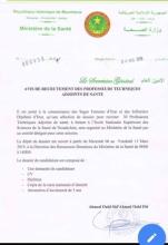 ترفع وزارة الصحة إلى علم القابلات وممرضي الدولة أن لجنة معيّنة من طرف وزارة الصحة ستقوم بانتقاء الملفات لاكتتاب 30 أستاذا فنيا مساعدا سيتم تكوينهم في المدرسة العليا للعلوم الصحية بنواكشوط.