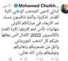 وجه رئيس الجمهورية، محمد ولد الشيخ الغزواني، في تغريدة على تويتر، عبارات التشجيع للاعبي المنتخب الوطني عشية مباراتهم الأولى في نهائيات كأس أمم إفريقيا.