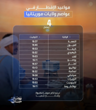 تتراوح أوقات الإفطار اليوم الأحد رابع أيام شهر رمضان المبارك 1447 هجرية، في عواصم الولايات الموريتانية ما بين 18:37 دقيقة في مدينة النعمة عاصمة ولاية الحوض الشرقي، و19:13 دقيقة في مدينة نواذيبو عا