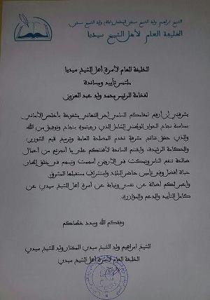 وعبر الخليفة العام لأسرة أهل الشيخ سيديا أصالة عن نفسه ونيابة عن الأسرة عن تأييده ودعمه ومؤازرته للرئيس.