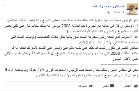 نشر عضو مجلس الشيوخ محمد ولد غده على صفحته على الفسيبوك ردا على ما اعتبره تصريحات رئيس الجمهورية بأنه يملك ملفات ضد الشيوخ سيكشف عنها في وقتها.
