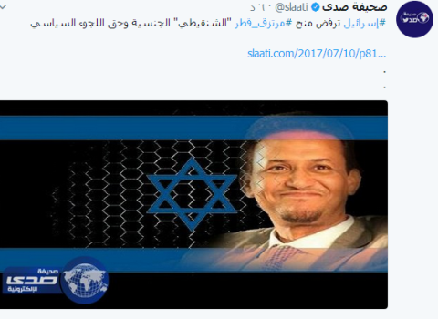 اتهمت صحيفة صدى السعودية الناشط مع النظام القطري محمد المختار الشنقيطي بطلب اللجوء السياسي إلى دويلة الكيان الصهيوني.