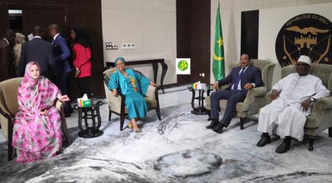 وكان في استقبال رئيس الجمهورية والسيدة حرمه لدى وصولهما مطار باماكو الدولي الرئيس المالي والسيدة حرمه واعضاء الحكومة والشخصيات السامية في الدولة المالية وسعادة السيد محمد ولد مكحله سفير موريتانيا في باماكو واللواء الذهبي ولد جعفر الملحق العسكري في سفارتنا في باماكو.