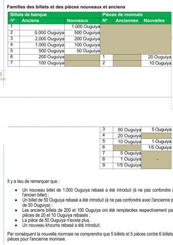و بحسب وثيقة صادرة عن البنك المركزي الموريتاني فإنه ستطرأ ورقة جديدة من نوع 1000 أوقية، و هي بقيمة 10.000 أوقية، فيما ستتحول ورقة 5000 أوقية التي كانت موجودة قديما إلى 500 أوقية ، و ورقة 2000 أوقية إلى 200 أوقية، و ورقة 500 أوقية إلى ورقة حديثة من نوع 50 أوقية.