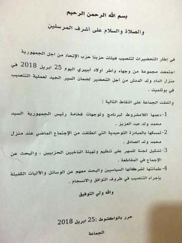 في إطار التحضيرات لتنصيب هيئات حزبنا حزب الاتحاد من أجل الجمهورية ، اجتمعت مجموعة من وجهاء وأطر أولاد أبييري اليوم 25 إبريل 2018م في منزل الداه ولد الددش من أجل التحضير لضمان السير الجيد لعملية التنصيب في بوتلميت .