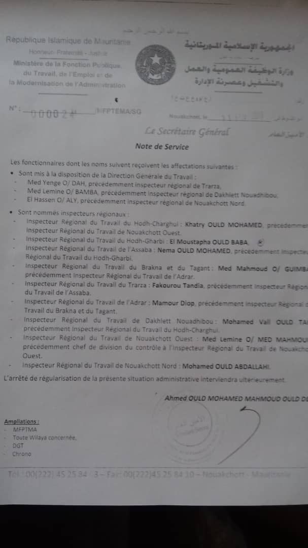 أصدرت وزارة الوظفية العمومية والشغل والتشغيل وعصرنة الإدارة مذكرات شملت إقالة ثلاثة مفتشي عمل جهويين من مناصبهم، كما تم بموجب المذكرات تحويلات شملت أغلب مفتشيات العمل. وحسب المذكرات التي حصلت عليها وكالة الحقيقة الإخبارية فقد تمت إقالة كل من: محمد الأمين ولد بمب الذي كان يشغل منصب المفتش الجهوي للعمل بداخلت أنواذيبو. الحسن ولد عالي الذي كان مفتشا جهويا للعمل في ولاية أنواكشوط الشمالية.