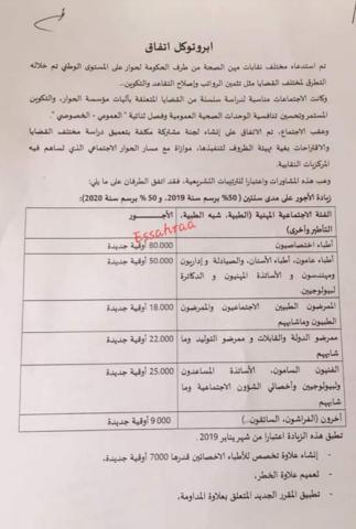 توصلت وزارة الصحة إلى اتفاق مع نقابات مهن الصحة يشمل رفع رواتب مختلف العاملين بالمجال الصحي بالإضافة إلى إصلاح نظام التقاعد وتوفير التكوين المستمر.