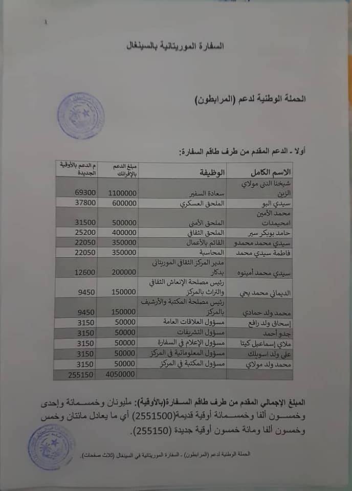 أكثر من ست ملايين ونصف مليون أوقية قديمة هي حصيلة دعم(المرابطون) المقدم من طرف طاقم السفارة الموريتانية بالسينغال وفي مقدمتهم سعادة السفير: شيخنا النني مولاي الزين، بالإضافة إلى الموظفين الموريتانين في الهيآت الدولية وبعض رجال أعمال الجالية وتجارها.