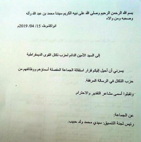 قدمت جماعة من حزب التكتل المعارض استقالتها من الحزب على خلفية الخلاف حول الانتخابات الرئاسية القادمة، وتضم الجماعة أعضاء من المجلس التنفيذي وأعضاء من المجلس الوطني واتحاديين فدراليين يبلغ عددهم جميعا 24 عضوا.