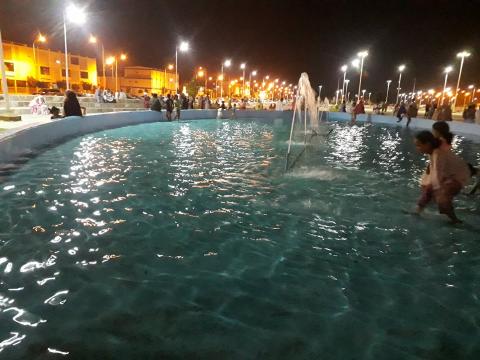 وبالساحة أطفال صغار يحركون ذلك الماء المتدفق في بهجة وسرور وجماعات من الناس من كل حدب وصوب.
