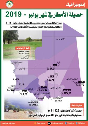 وتقدمت ولاية كيديماغه ب 449 مم على أقرب ولاية لها؛ وهي الحوض الغربي، فيما لم تشهد 6 ولايات أي أمطار خلال شهر يوليو وهي؛ ولايات نواكشوط الثلاث، ونواذيبو وإنشيري وتيرس الزمور.