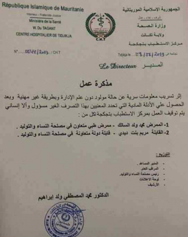 قرر مدير مستشفى تجگجه، الدكتور محمد المصطفى ولد ابراهيم، توقيف ممرض وقابلة عن العمل لانتهاكهما خصوصية المريض، وذلك في مذكرة عمل أصدرها اليوم الخميس(الصورة).