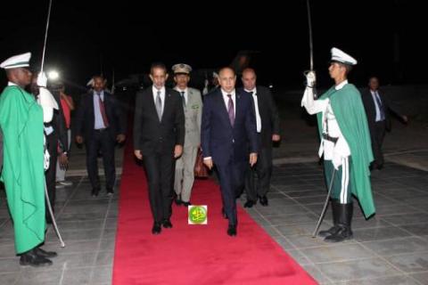 واستقبل رئيس الجمهورية لدى وصوله مطار نواكشوط الدولي "أم التونسي" من طرف الوزير الأول السيد اسماعيل ولد بده ولد الشيخ سيديا والوزير الأمين العام لرئاسة الجمهورية السيد محمد سالم ولد البشير وعدد من أعضاء الحكومة و قائد الأركان الخاصة لرئيس الجمهورية والمديرة المساعدة لديوان رئيس الجمهورية و والي نواكشوط الغربية ورئيسة المجلس الجهوي لجهة نواكشوط.