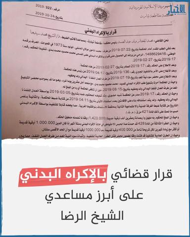أصدر قاضي محكمة مقاطعة تيارت بولاية نواكشوط الشمالية قرارا بالإكراه البدني على محمد محمود محمد بدي أبرز مساعدي الشيخ_الرضا.