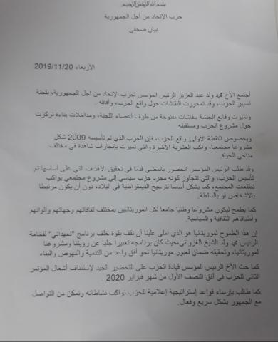 أصدر الحزب الحاكم بيانا جديدا بعد اجتماع لجنة تسيير الحزب بالرئي السابق محمد ولد عبد العزيز.