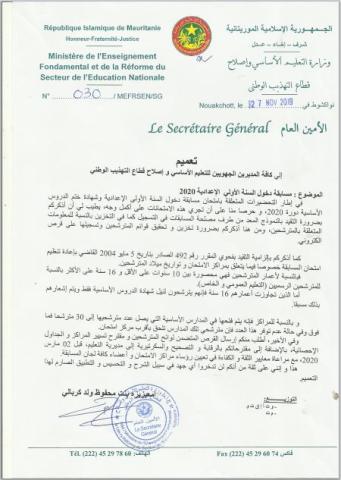 وتضمن التعميم أنه بالنسبة لأعمار المرشحين فهي محصورة بين 10 سنوات على الأقل و16 سنة على الأكثر بالنسبة للمرشحين الرسميين في التعليمين العمومي والخاص.