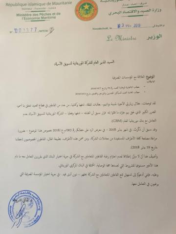 وقال وزير الصيد في وثيقة وجهها لمدير الشركة الموريتانية لتسويق الأسماك، إنه تلقى طلبات من الفاعلين في قطاع الصيد تتعلق بما أسموه "الضرر الكبير الذي لحق بهم جراء ما قالوا إنه قرار سبق أن اتخذته الشركة الموريتانية لتسويق الأسماك بعدم التعامل مع بنك موريتانيا العام".