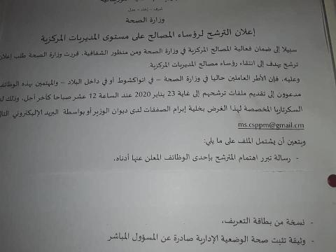 أعلنت وزارة الصحة الموريتانية فتح باب الترشح لرؤساء المصالح على مستوى المديريات المركزية.