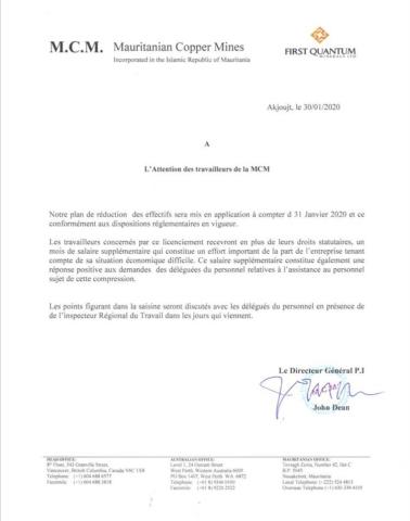 اعلنت شركة نحاس موريتانيا MCM عن تحديد يوم غد الجمعة 31 يناير 2020 موعدا لفصل 140 من عمالها، وذلك بعد أسبوعين من إعلان قرار الفصل.