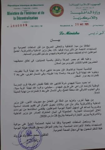 واعتبر البيان أن حدود “مدينة نواكشوط ينتهي شرقا عند نهاية قرية تيفيرت، وجنوبا عند نهاية قرية اتويرجه، وشمالا عند بلدة اطويله، وفي الشمال الغربي على بعد 7 كلومترات بعد دوار المطار”.