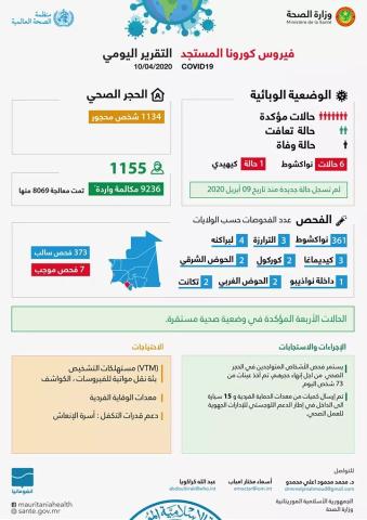 وقالت الوزارة في نشرتها الصحية الصادرة مساء اليوم 10 أبريل 2020 إن عدد المحجوزين حجرا صحيا بلغ 1134 على عموم التراب الوطني، مشيرة إلي أن آخر حالة تم تسجيلها كانت يوم 09 إبريل الجاري.