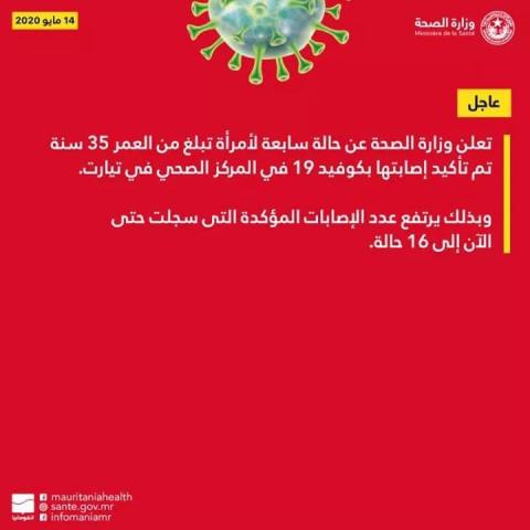 أعلنت وزارة الصحة الموريتانية الليلة عن سابع إصابة مؤكدة بفيروس كورونا المستجد ليرتفع عدد الإصابات المؤكدة في البلاد إلى 16 حالة.