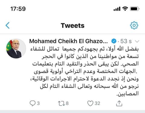 أكد الرئيس محمد ولد الشيخ الغزواني تماثل 9 من المصابين بفيروس "كورونا" للشفاء.