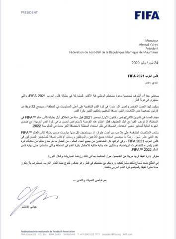 وجه الاتحاد الدولي لكرة القدم الفيفا دعوة رسمية للاتحاد الموريتاني، من أجل مشاركة موريتانيا في "كأس العرب فيفا 2021" التي ستقام في قطر.