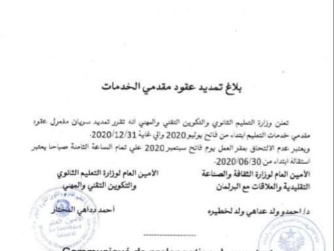 أعلنت وزارة التعليم الثانوي والتكوين التقني والمهني أنه تقرر تمديد سريان مفعول عقود مقدمي خدمات التعليم ابتداء من فاتح يوليو 2020 و إلى غاية 31- 12- 2020 .