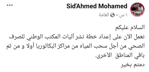 أعلن وزير المياه والصرف الصحي سيدي أحمد ولد محمد أن قطاعه يعمل على إعداد خطة لنشر آليات سحب المياه التابعة للمكتب الوطني للصرف الصحي، مؤكدا أن سيمنحون مراكز امتحان الباكلوريا الأولية.