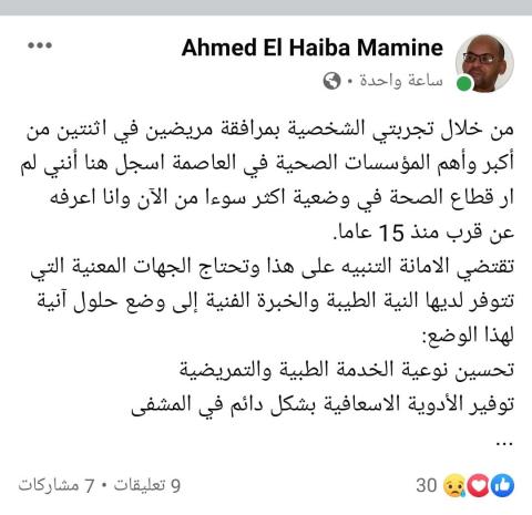 وأضاف في تدوينة عبر حسابه على فيسبوك: "من خلال تجربتي الشخصية بمرافقة مريضين في اثنتين من أكبر وأهم المؤسسات الصحية في العاصمة أسجل هنا أنني لم أر قطاع الصحة في وضعية أكثر سوءا من الآن وأنا اعرفه عن قرب منذ 15 عاما".