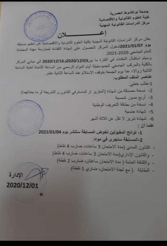 أعلنت جامعة انواكشوط عن تنظيم مسابقة للحصول على شهادة الكفاءة لممارسة مهنة المحاماة للعام الجامعي 2020/2021، وحدد الاعلان فترة استقبال الملفات مابين 03-12-2020و16-12- 2020