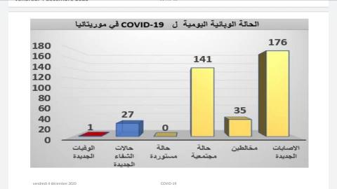 أعلنت وزارة الصحة الموريتانية تسجيل حالة وفاة، و176 إصابة جديدة بفيروس كورونا المستجد خلال الأربع وعشرين ساعة الأخيرة.