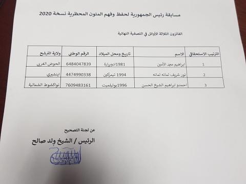 في مسابقة رئيس الجمهورية لحفظ وفهم المتون المحظرية، وذلك بعد فرزت نتائج تصحيح التصفية النهائية من امتحان المسابقة.